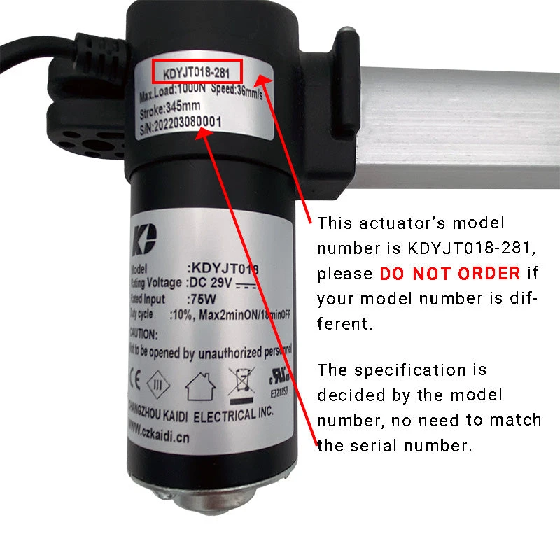 - This actuator is NOT universal, DO NOT ORDER if your linear actuator’s model number is not KDYJT018-281
